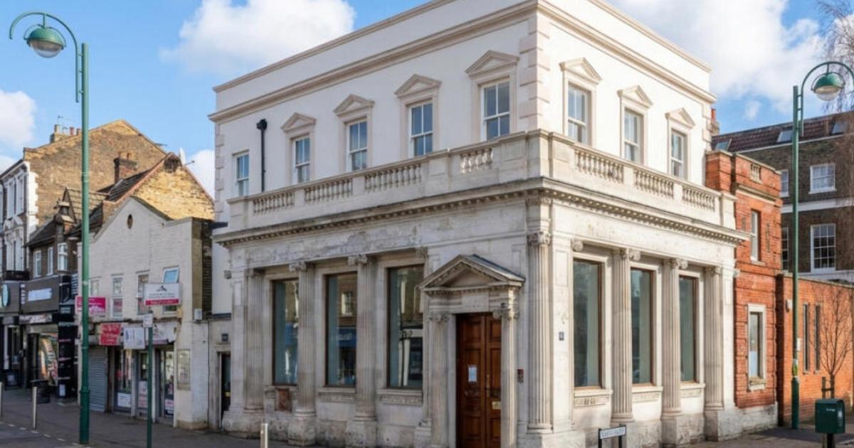 The listing reads: “Occupying a prominent position on Leytonstone’s High Road, the building announces itself with a classical stone façade, articulated by pilasters and a formal entrance of institutional character.