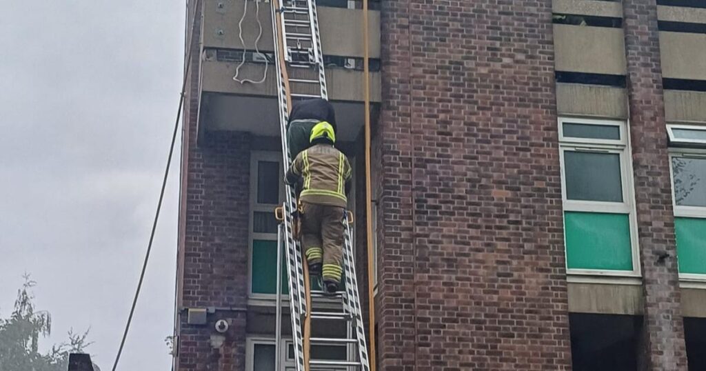 Four people and a dog have been rescued from the blaze via a rescue ladder and fire escape hoods, with one person being carried down by firefighters.
