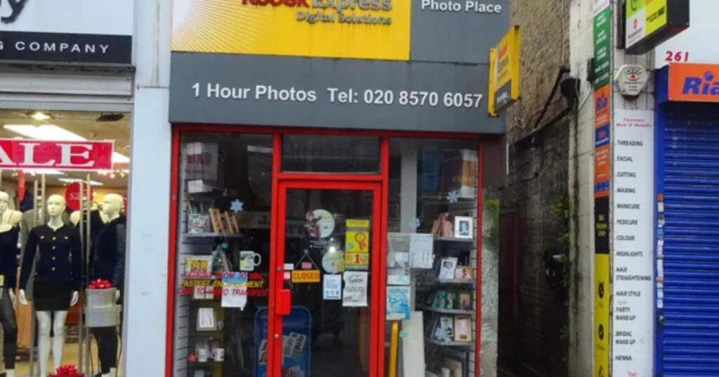 The shop has a grey and yellow frontage, complete with a red-framed glass door and matching red-framed windows either side that are filled with photographs and other related items.