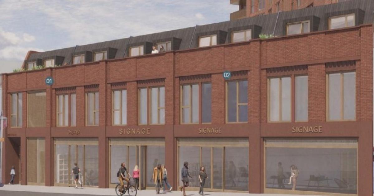 Currently a single storey commercial building – formerly occupied by an Iceland store and now a banquet hall catering company – and car park, the scheme proposes a mix of shops and flats.